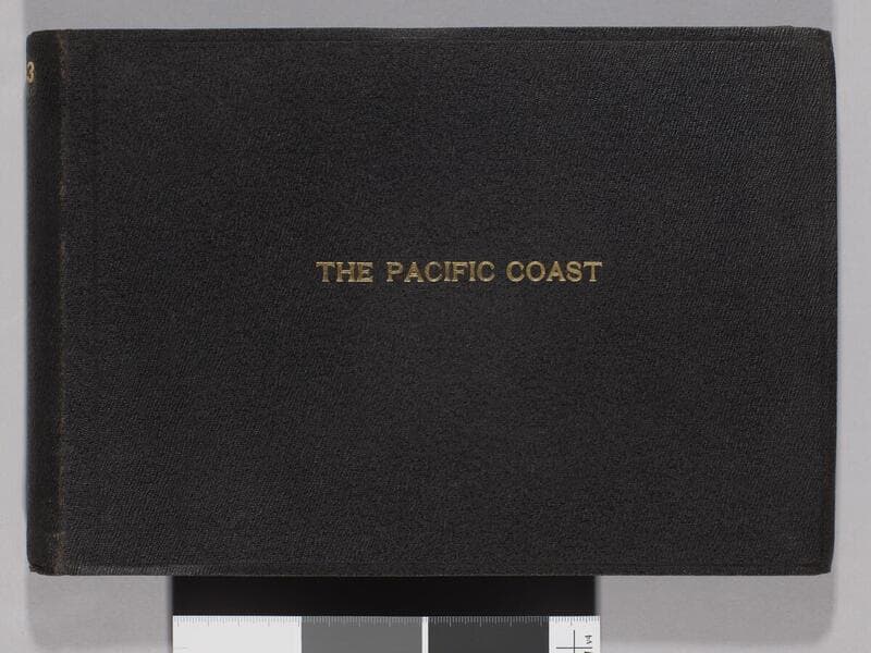 Bound in black textured leather. The title, "Dirigo Voyage 1912," is embossed in the center of cover in gold lettering. The number "73" is affixed to top of spine with glue.