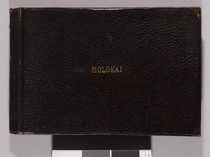 Album is bound in dark faux animal skin material. A fleur de lis graphic element is embossed in the center of cover. The title, "Molokai" is embossed below that in gold lettering. The number "55" is affixed to the top of spine with glue. This this is the third album of Molokai photographs. Images in this album include clinical photographs of leprosy patients likely taken in Dr. William Goodhue's medical clinic, studio portraits, and panoramic views of Molokai landscapes.