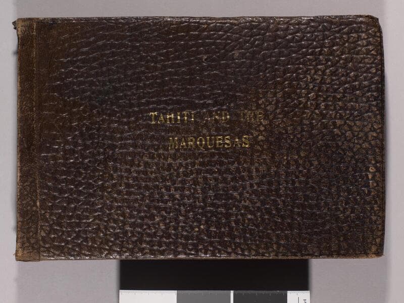 Album is bound in brown faux animal skin material. A fleur de lis graphic element is embossed in the center of cover. Below that the title, "Fair Tahiati [sic]," is embossed in gold lettering. The number "59" is affixed to the top of spine with glue. Images are primarily commercial souvenir photographs and postcards of Tahitians. Also some photos likely taken by a news service, of storm damage from the cyclone that took place in French Polynesia in 1906.