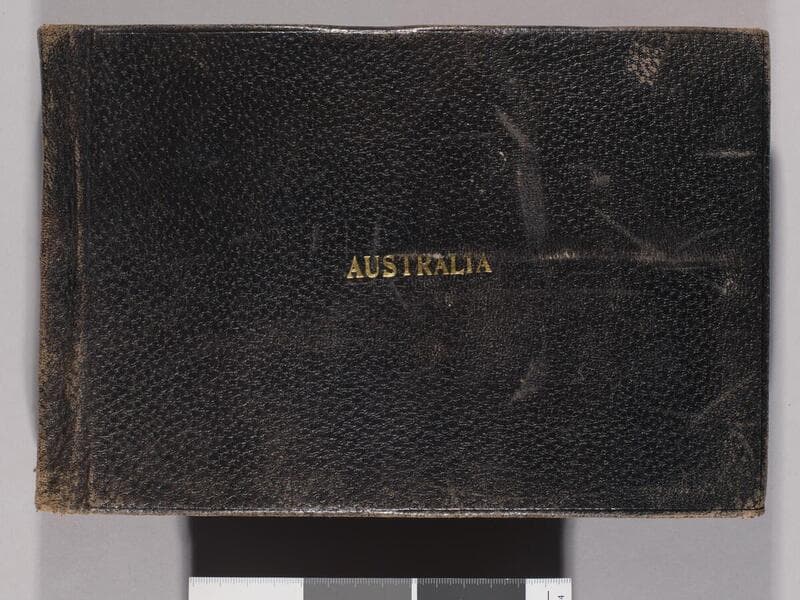 Bound in textured black material. The title, "In Cannibal Isles" is embossed in gold lettering in the center of cover. The number "13" is affixed to the top of spine with glue. Images are all commercially produced souvenir prints of indigenous island peoples in the South Pacific.
