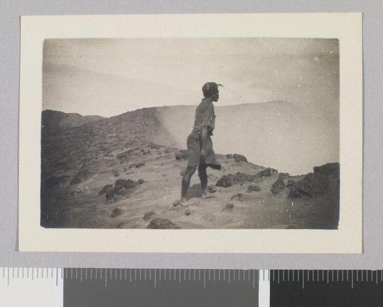 Person in distance walks in crater of volcano.