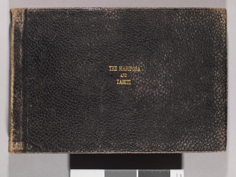 Album is bound in brown faux animal skin material. A fleur de lis graphic element is embossed in the center of cover. Below that the title, "Fair Tahiati [sic]," is embossed in gold lettering. The number "59" is affixed to the top of spine with glue. Images are primarily commercial souvenir photographs and postcards of Tahitians. Also some photos likely taken by a news service, of storm damage from the cyclone that took place in French Polynesia in 1906.