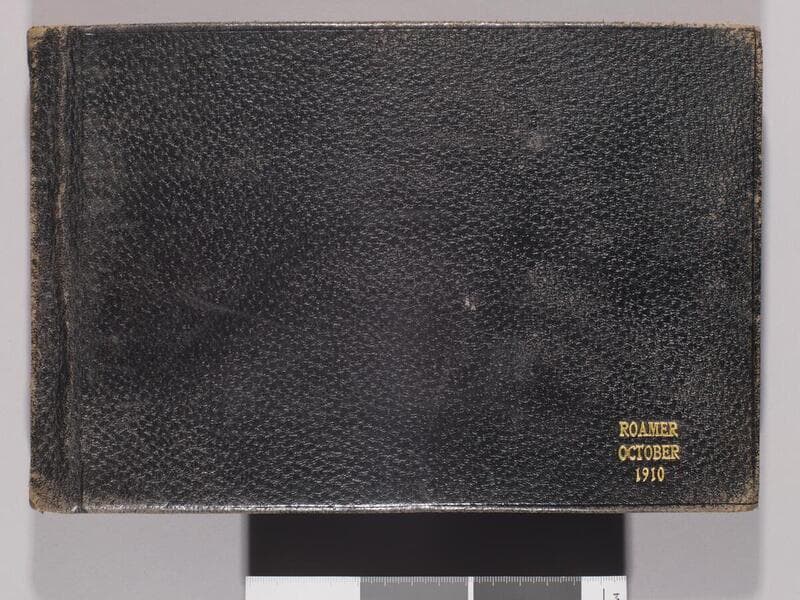 Bound in textured black material. The title, "Roamer 1911 - 1912 - 1913" is embossed in the center of cover in gold lettering. Images are of Jack and Charmian London, Nakata, their Japanese servant, and other crew on the Roamer as they sail the Sacramento and San Joaquin Rivers.