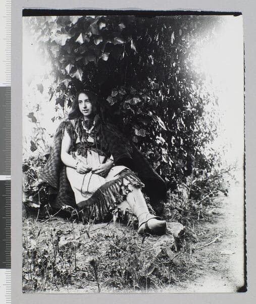 Beth Wiley Baxter standing in front of ivy covered structure wearing Native American costume.