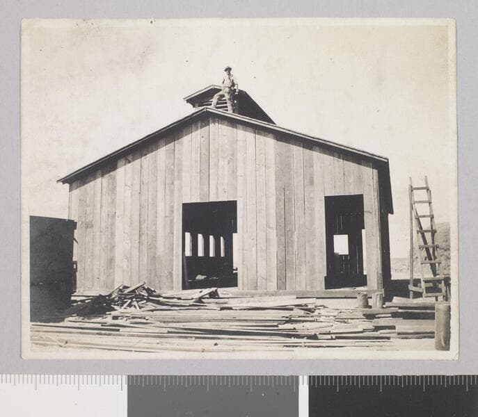 Barn building under construction on Jack London Ranch. One man in hat stands in front beside a ladder.