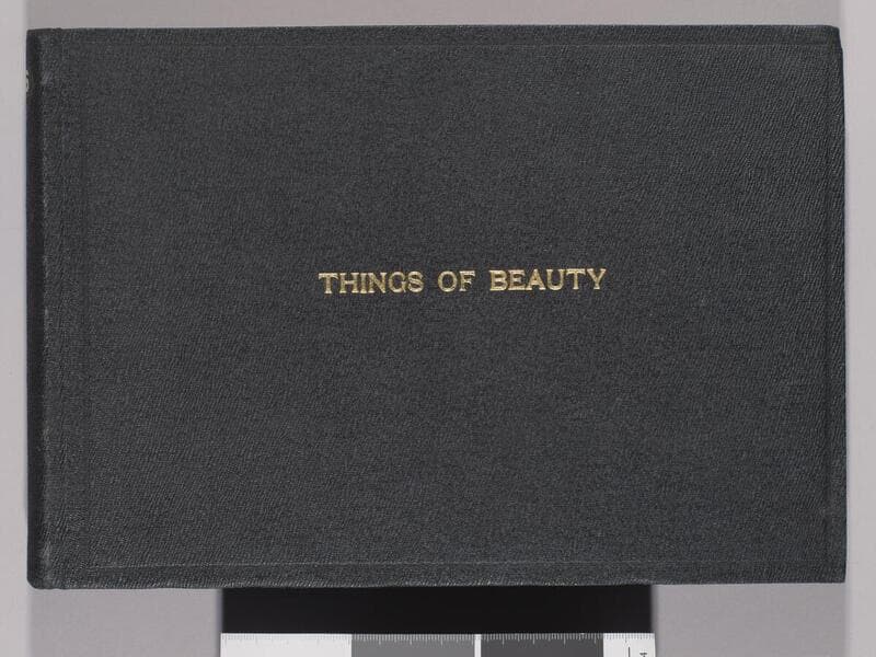 Bound in textured black material. The title "The Beauty of the World" is embossed in gold lettering in the center of cover. The number "14" is affixed to the top of spine with glue. Contents are primarily clippings and print memorabilia collected by Charmian London after Jack London's death.