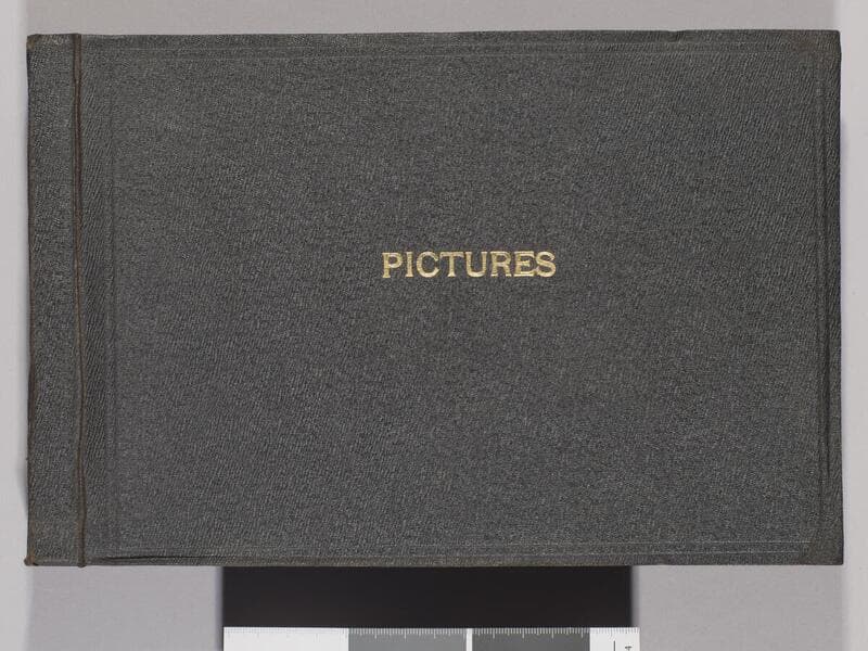 Bound in black textured material. The title "'Pictures! Pictures! Pictures!'" is embossed in gold lettering in center of cover. The number "18" is affixed to the top of spine with glue. Images are clippings and souvenir photographs collected by Charmian London of landscapes and other items of personal interest.