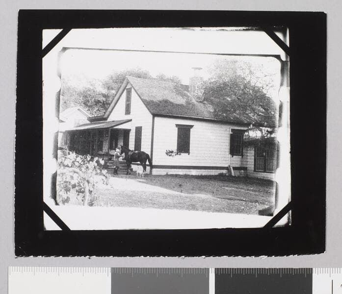 Back porch and side of cottage on Jack London Ranch. A group, possibly including Emma Growall, Lurline Lyons and son Montel Montgomery, stand beside the ones while another person reclines in a chair under a tree.