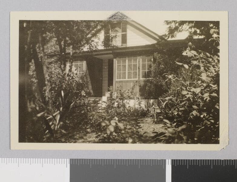 Back porch and side of cottage on Jack London Ranch. A group, possibly including Emma Growall, Lurline Lyons and son Montel Montgomery, stand beside the ones while another person reclines in a chair under a tree.