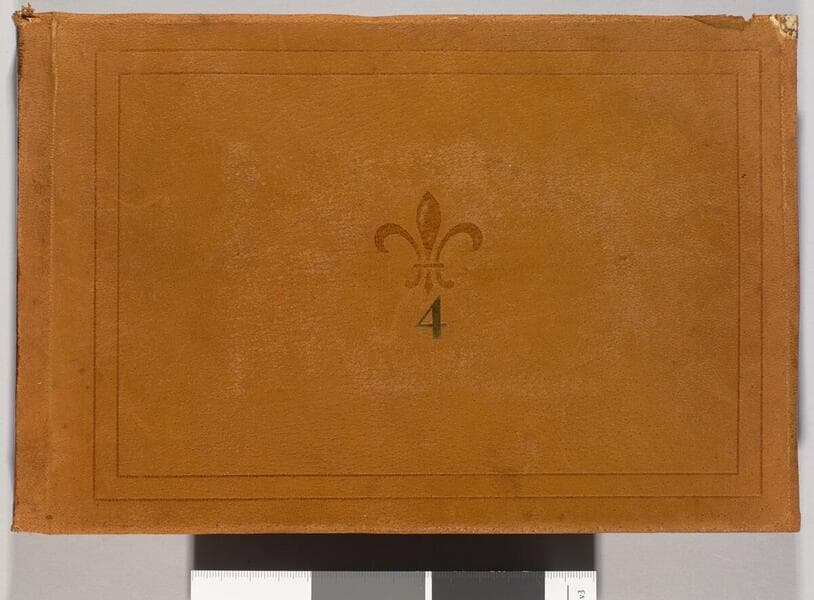 Album is bound in light brown leather with a fleur de lis design element and the number "1" in gold embossed on cover. The number "1" is affixed to top of spine with glue. Contains photographs taken by Jack London while on assignment to cover the Russo-Japanese War.