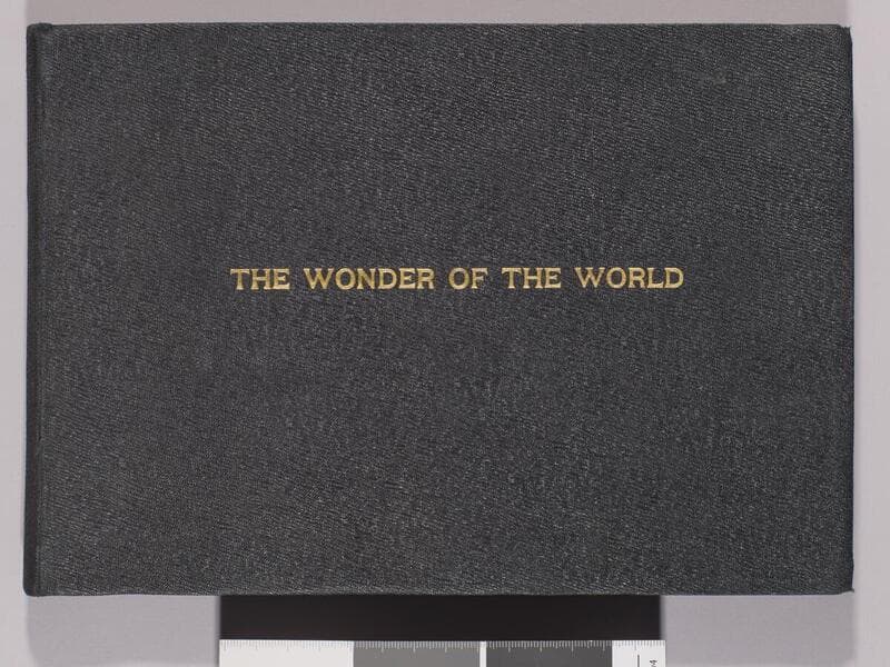 Bound in textured black material. The title, "The World Over," is embossed in gold lettering in center of cover, and a graphic flourish is embossed in gold below title. The number "8" is affixed to top of spine with glue. Images are nearly all souvenir photographs compiled by Charmian London of various locales, some she visited after Jack London's death. Also included are four original political cartoons drawn in ink and signed, "Johnson."