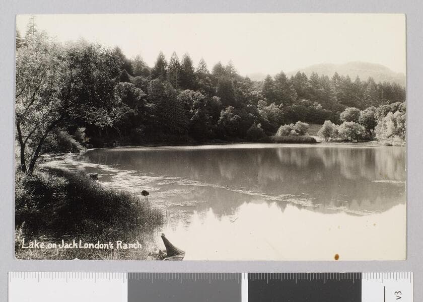 Lake near meadow and surrounded by trees. Trees reflected in lake with dock to right. On Jack London Ranch.