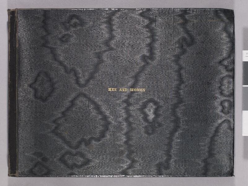 Album is bound in black, textured leather. A fleur de lis graphic element is embossed in the center of cover. The title, "A Dream of Fair Women," is embossed in gold lettering in the lower right corner of cover. The number "79" is affixed to the top of spine with glue. Album contains images collected by Charmian London, including clippings of artwork and a few photographs of nude women.