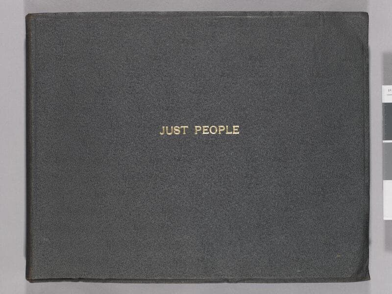 Bound in black textured leather. The title "Small Folk" is embossed in told lettering in the center of cover. The number "80" is affixed to the top of spine with glue. Images are of children of friends and extended family.
