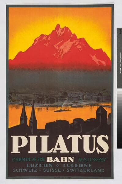 "B"--artist's signature in the lower right corner of the image. ""Wolfsberg" Zürich"--small text, printed, along the bottom margin. "E"--on verso, in ms., in blue crayon. Variant, title is in German, can be seen at Swiss National Library (SNL), National Union Catalogues, Posters – Collection of Swiss posters, http://posters.nb.admin.ch/cgi-bin/hi-res/hi-res.cgi?image=SNL_TOUR_932.jpg