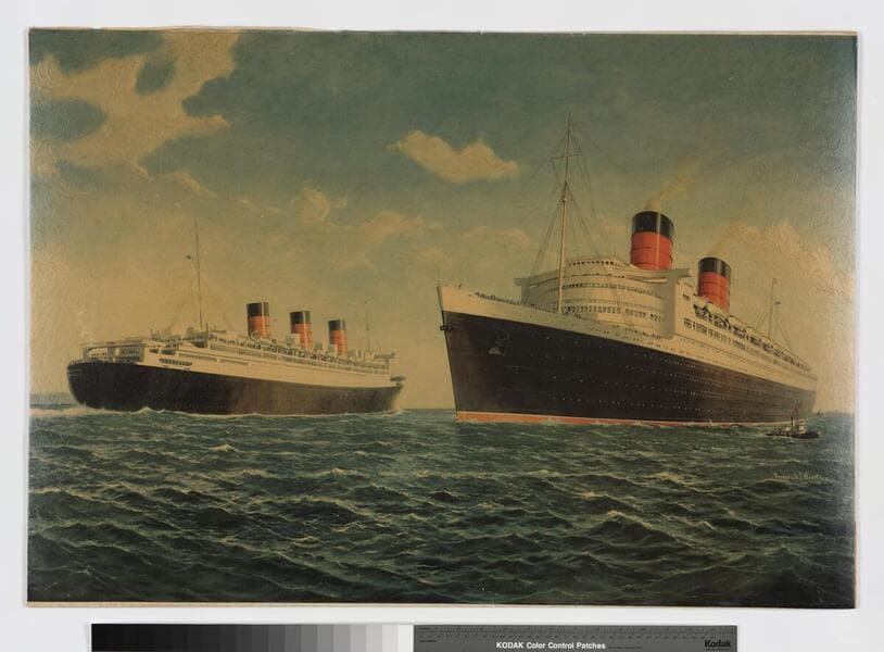 "Frederick J. Hoertz '48"--artists signature in lower right of the image. Title information from below the image. Date from signature. priMISC/M KM0492b is a variant with margins cut off, affixed to a board and varnished to look like artwork. Focus of item: Queen Mary ; Queen Elizabeth.