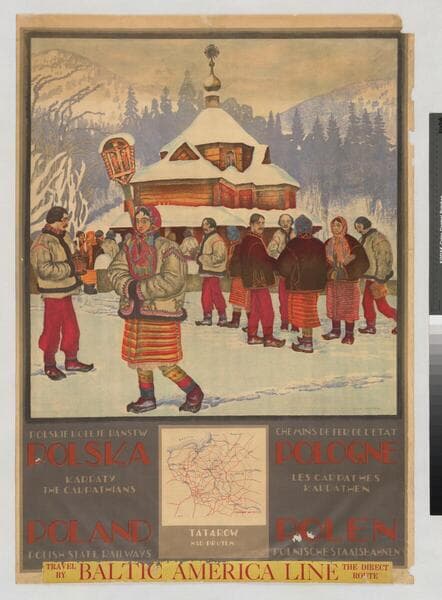 Map in inset centered below main image shows pre-Second World War Poland with rail lines is red; Tatarów is identified in the lower right of the map. "Wład. Jarocki"--artist's signature reproduced in image, lower right corner. "Druk offsetowy Lit. A. Pruszyński, Kraków"--text in margin, lower right corner. "Printed in Poland - Drukawano w Polsce"--text, printed smaller type, in margin, lower left corner. "Travel to Poland on the express ships of the Cunard Line / Berengaria Aquitania Mauretania"--text on a strip pasted onto the bottom of the poster. Tatarów became part of the Ukraine following the Second World War, now known as Tatariv. Same poster as ephKMEpos 00033, however this copy has not been trimmed along the bottom edge.