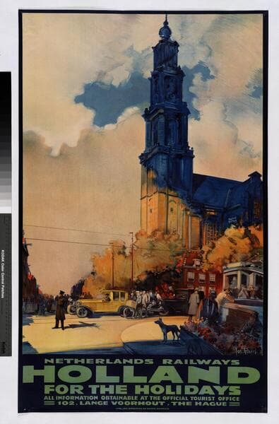Title is below the image. "Jos. Rovers"--artist's signature reproduced in lower right corner of the image. "Netherlands Railways"--above the title, smaller type. "All information obtainable at the Official Tourist Office, 102, Lange Voorhout, The Hague"--text below the title, smaller type. "Lith. Emrik & Binger, -Haarlem (Holland)"--small type, center, bottom margin.