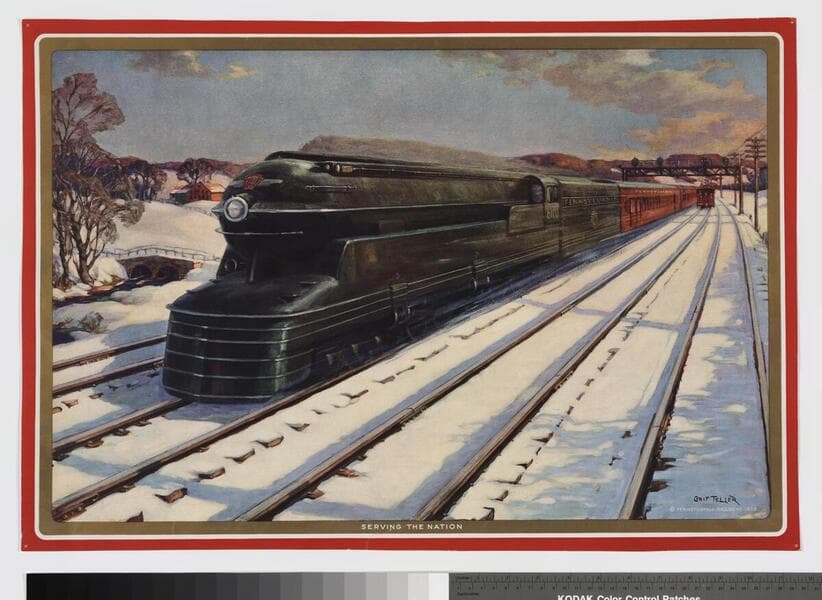 "Grif Teller"--artist's signature, lower left corner of the image. "©Pennsylvania Railroad 1940"--printed text, next to artist's signature, lower left corner of the image. Cut from a calendar.