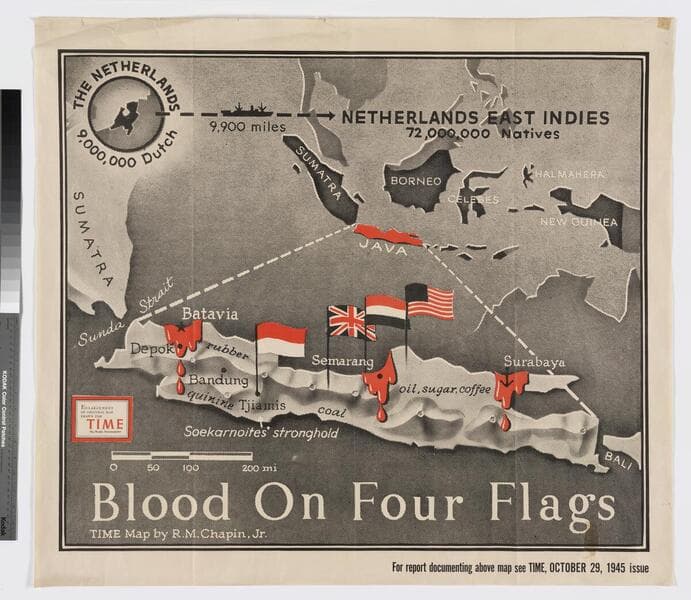 "Time map by R.M. Chapin, Jr."--lower left corner of the map. "Enlargement of original map drawn for Time, the weekly newsmagazine"--inset text box, lower left of map. "For report documenting above map see Time, December 17, 1945 issue"--text below map, large text, right corner. Scale is 5 7/8 inches = 200 miles.