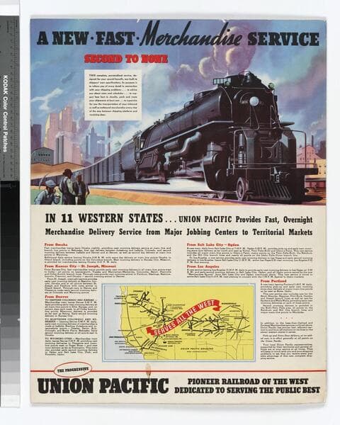 A new fast merchandise service second to none : in 11 western states ... Union Pacific provides fast, overnight merchandise delivery service from major jobbing centers to territorial markets