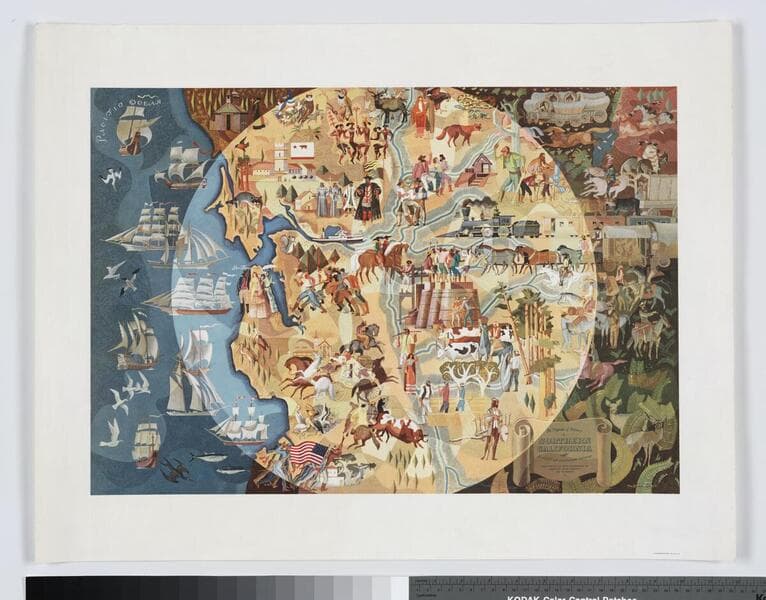 The collection of images include a botanical specimen photograph card (sarcodes sanguniea torrey or snow plant of the Sierra), a U.S. Army encampment scene (Sacramento), portraits, and buildings. Among the photographs are roof tops (San Jose), the Santa Barbara Mission capturing priests in the corridor, Auburn Poultry Producer (store facade), William Chapman Ralston (1826-1875) San Francisco Banker, Miss Adams (Mormon actress), Mary Anderson's farm (Oakland), and a postcard photograph of First Bank in Northern California at Coloma. The Auburn Poultry photograph is noted as being a gift of Collis Halladay (1893) and a majority of the photographs cite "Hardy, 1945" which may refer to the original Grahame Hardy collection acquired in 1945.