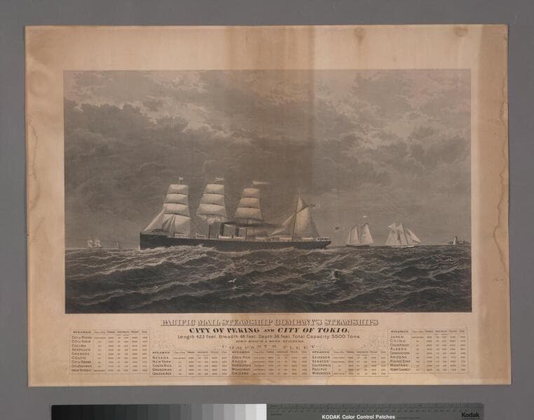 The broadside from Pacific Mail Steamship Company is in Chinese and provides information on the schedule between San Francisco - Hong Kong and Hong Kong - San Francisco; at the top of the broadside is a Chinese calendar; next to, and below, the calendar are advertisements for various companies; below the advertisements is the schedule for the vessels and connecting trains in San Francisco; the names of eight PMSSCO vessels have been translated into Chinese, including the Peru and the Peking. "10/74 ca. 1880 MKS 95"--top right corner, in ms., in pencil. "1898 RyRxo 200-"--on mat, lower right corner, in ms., in pencil.
