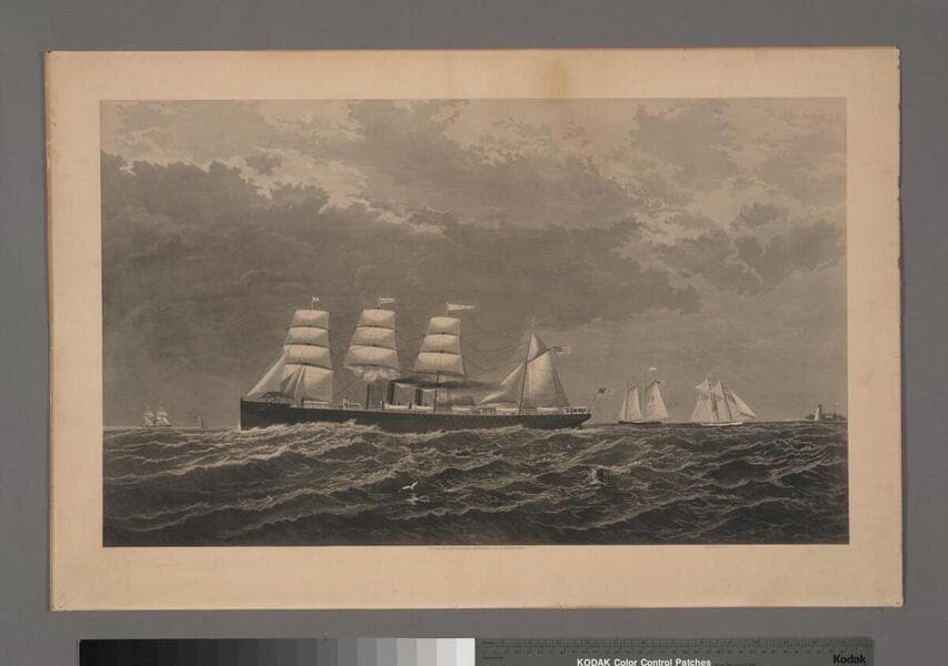 Photomechanical copy of etching without lettering, see priMISC/M KM0071a. The City of Tokio is in the far left distance; print also shows the Yacht Magic and the Pilot Boat 18 in the right near distance. Magic won the America's Cup in 1870. The City of Peking is off of Sandy Hook, which can be seen in the right distance. "Eldredge Collection Mariners' Museum"--stamp in brown ink, verso, lower right corner. Focus of item: City of Peking.