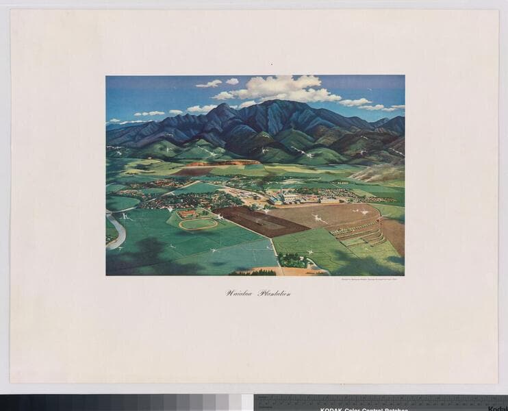 Painted by Melbourne Brindle. Illustrated view of the Ewa Plantation, Oahu, Hawaii from a atop a hill.