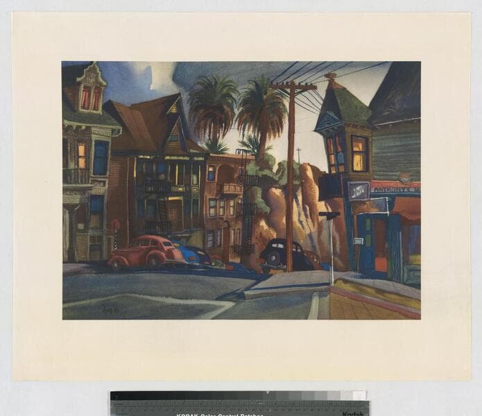 A view of Main Street in Santa Ana. The street is lined with parked cars and stores and shops, such as Pep Boys, Santa Fe, and Western Union. The large building on the right is Santa Ana City Hall. Farther down the street are an Odd Fellows lodge and the West Coast Theater.