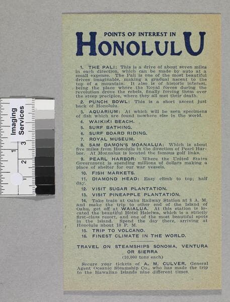 Alt. title: Matson line LASSCO line Oceanic line to Hawaii and, via Honolulu, Samoa and Fiji to New Zealand and Australia. "40M--11-32"--printer's note on p. [7]. "J.H. Kemble."--typed ownership note on p. [7]. Promotional pamphlet for LASSCO coastwise service; including photos of vessels and destinations, an advertisement for LASSCO service to Hawaii and Matson service to Hawaii and the South Pacific. Focus of item: Yale ; Matson ; Oceanic.