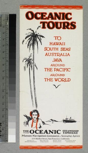 "5. Girl of paradise South Seas Oceanic S. S. Co."--illustration note, front cover illustration, upper right corner. "7. Pala, South Seas. Oceanic S. S. Co."--illustration note, back cover illustration, upper left corner. Missing illustration, p. [3], lower left corner. Advertisement for travel to Hawaii, South Seas and Australia on Oceanic; including vessel ratings, passenger testimonials, and agent contact information.