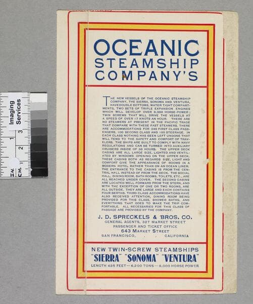 Proposed sailings and fares for Oceanic cruises; passenger regulations and route map included. Focus of item: Sierra ; Sonoma ; Ventura.