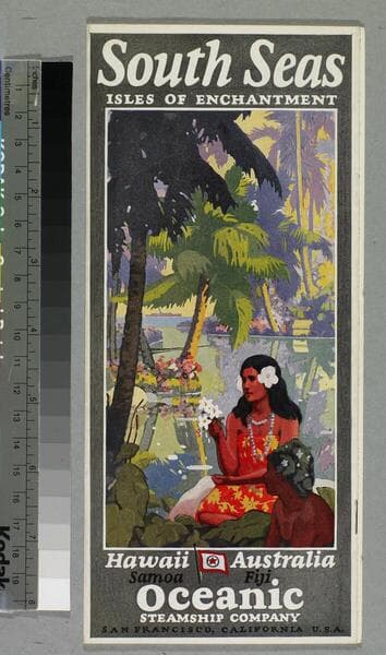 "5. Girl of paradise South Seas Oceanic S. S. Co."--illustration note, front cover illustration, upper right corner. "7. Pala, South Seas. Oceanic S. S. Co."--illustration note, back cover illustration, upper left corner. Missing illustration, p. [3], lower left corner. Advertisement for travel to Hawaii, South Seas and Australia on Oceanic; including vessel ratings, passenger testimonials, and agent contact information.