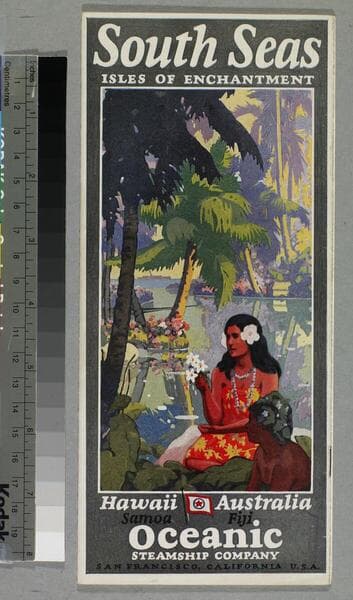 Alt. title: Hawaii - Australia - Samoa - Fiji. Advertisement for Oceanic service to Hawaii, South Pacific, and Australia; including map, vessel descriptions, and agent contact information.