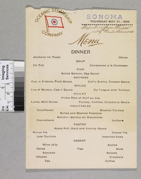 Dinner menu onboard S. S. Sonoma