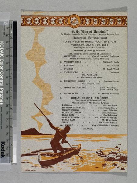 "Thursday, evening, March 6, 1930, at 8:15pm"--printed, top of p. [1]. Program folds into postal envelope. Program for concert on board the S.S. Calawaii en route from Honolulu to Los Angeles. Focus of item: Calawaii.