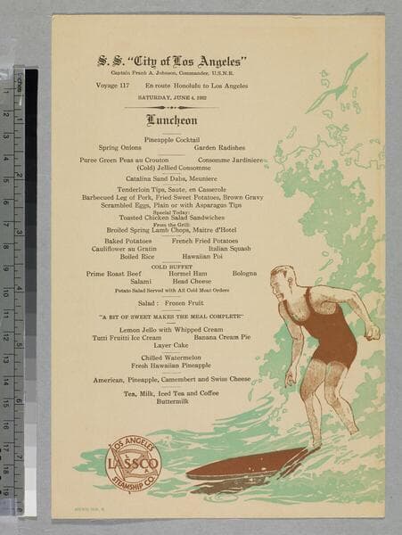 Cover title: Los Angeles - Hawaii. "Voyage 117 en route: Honolulu to Los Angeles Saturday, June 4, 1932"--p. [2], bottom center. Menu can fold into postal envelope. Dinner menu with concert program. Focus of item: City of Los Angeles.