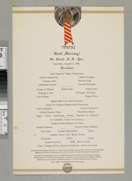 "Tuesday, July 5, 1932"--p. [1]. Cover title: LASSCO coastwise service palatial super-express steamship S.S. Yale San Francisco - Los Angeles - San Diego. Shipboard dinner menu with music program; menu can fold into postal envelope. Focus of item: Yale.