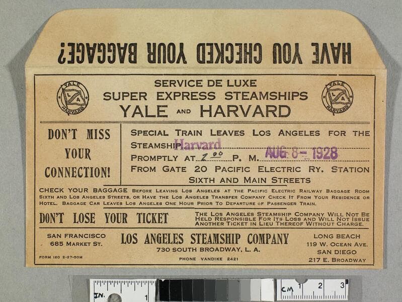 "Yale... Aug 16 1933..."--stamped in blue ink, recto, in vessel and date fields. "4"--ms. inscription in pencil, recto, date field. "Reed & Miller, Agents 404 E. Colorado Street Pasadena, - - California"--stamped in blue ink, recto. "J.H. Kemble."--typed, envelope flap verso, lower right corner. LASSCO ticket envelope; baggage and train information on recto, map of downtown Los Angeles on verso. Title supplied by cataloger.