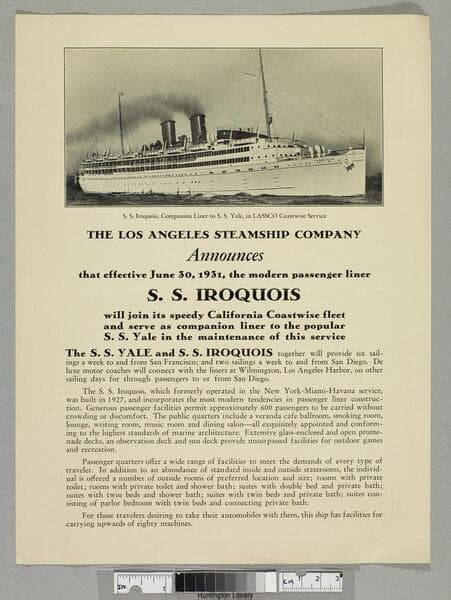 The Los Angeles Steamship Company announces... S.S. Iroquois will join join its speedy California Coastwise fleet and serve as companion liner to the popular S.S. Yale in the maintenance of this service