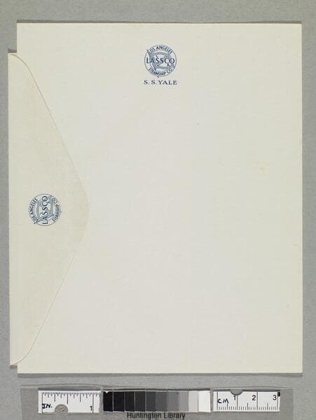 "Yale... Aug 16 1933..."--stamped in blue ink, recto, in vessel and date fields. "4"--ms. inscription in pencil, recto, date field. "Reed & Miller, Agents 404 E. Colorado Street Pasadena, - - California"--stamped in blue ink, recto. "J.H. Kemble."--typed, envelope flap verso, lower right corner. LASSCO ticket envelope; baggage and train information on recto, map of downtown Los Angeles on verso. Title supplied by cataloger.