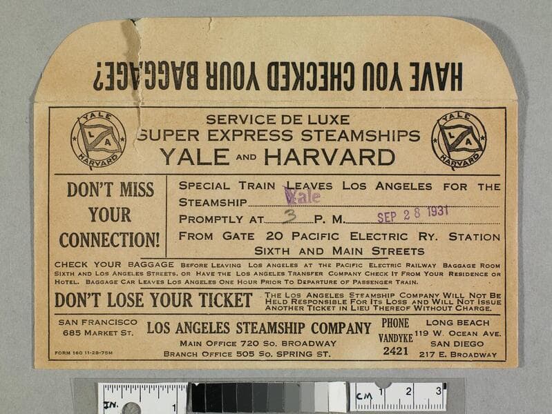 "Yale... Aug 16 1933..."--stamped in blue ink, recto, in vessel and date fields. "4"--ms. inscription in pencil, recto, date field. "Reed & Miller, Agents 404 E. Colorado Street Pasadena, - - California"--stamped in blue ink, recto. "J.H. Kemble."--typed, envelope flap verso, lower right corner. LASSCO ticket envelope; baggage and train information on recto, map of downtown Los Angeles on verso. Title supplied by cataloger.
