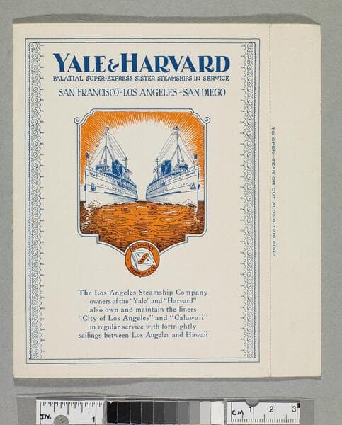 Cover title: Yale & Harvard: palatial super-express sister steamships in service San Francisco - Los Angeles - San Diego. "Thursday, December 30th, 1926"--p. [1]. "Yale Dec. 31, 1926 Dear Marion The Morisons wished to make the trip from San Francisco by boat. The Yale is a very comfortable boat and I got along nicely. [More anon?] Mother"--ms. inscription p. [1]. "214 Fifth St. San Diego California... Miss Mariano Day Passenger Raymond-Whitcomb Cruise S.S. Carinthia Messrs. Jannel Gros. 9 Sharia Kamel Cairo Egypt"--ms. inscription, back cover. "San Diego Calif. Jan 3 1927 830 AM"--stamped, black ink, back cover. Shipboard dinner menu and music program; menu folds into postal envelope. Focus of item: Yale.