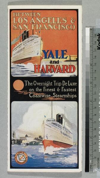 "Jack Kemble"--stamp, in black ink, on back cover. At head of title: San Francisco Los Angeles San Diego. Promotional pamphlet for steamship service along the California coast and to Hawaii, including images of vessels and ports, and a route map. Focus of item: Yale ; Harvard.