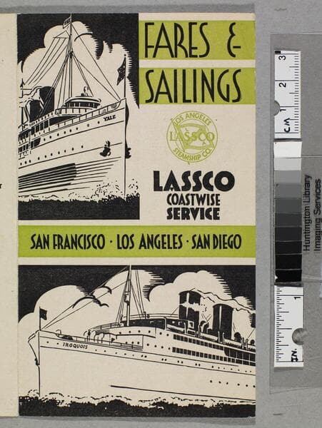"P-16 (172-25M 6-34)"--printer's note, back cover, lower right corner. "Reservation -- Tickets, Hink's Travel Bureau, Shattuck Ave. at Kittredge St. Phone Berkeley 1100"--stamped in purple ink, back cover, upper right corner. "J.H. Kemble"--typed, back cover. LASSCO California coastwise service with schedules, fares, and connection information. Focus of item: Yale.