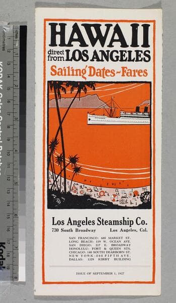 "W.R. Flynn, Agent, Pasadena, Calif."--stamped in purple ink, back cover. "Issue of March 1, 1927 (do not use previous issues)"--front cover. Pamphlet promoting LASSCO service to Hawaii with fare, schedule, tour, and island information included; section on cruises to destinations east of Hawaii inlcuded.