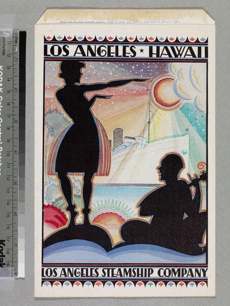 Dinner menu and promotional shipboard envelope for patrons aboard the S.S. Calawaii, dated Sunday, March 31, 1929. Menu folds into a postal envelope. Focus of item: Calawaii.