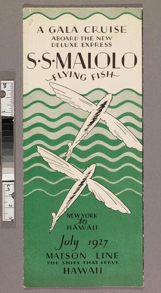 "A-301 (KC 11-27-42M)"--back cover, lower left corner. Advertisement for express cruise between California and Hawaiian on the SS Malolo ; including fares, sail dates, vessel specifications, and description of island amenities. Focus of item: Malolo.