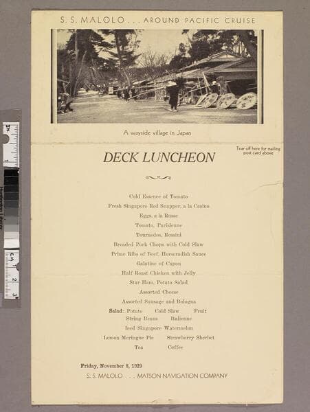 "Saturday, December 6, 1930"--recto, bottom. Lunch buffet menu for the around the Pacific cruise. Focus of item: Malolo.